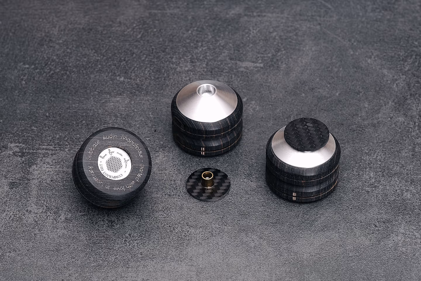 A set consists of three feet. The ebony wood stands on the floor, e.g. our Composant S base. The carbon is placed on top of the aluminum end and the carbon thus touches the component floor. Since the CF is not screwed, its position under the device can now be adjusted in such a way that a harmonic overtone frequency is achieved with the signal. This is necessary because every audio device is manufactured differently. The point on the surrounding surface of the CF must always point forward (front of the device) with all three feet.